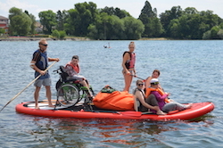 La megacraft peut accueillir de 6 à 8 personnes. Wind'SUP a testé une balade avec une équipe des Perce-Neige et a sanglé une chaise roulante. Très stable, pouvant accueillir des poufs ou autres sièges, cette SUP peut même être utilisée pour une fondue extrême !